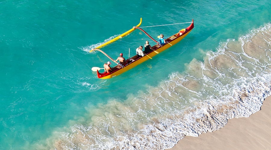 As the sea pushed our outrigger over the water, we rested our paddles on our laps and took in a new perspective on Waikiki. There was Diamond Head, piercing the sky like a giant shark’s fin, and there was the beach rising up in front of us, bright with white sand. Grinning from ear to ear, we all leaned back in our seats to take in the sound of the water roiling and splashing against the sides of our canoe.