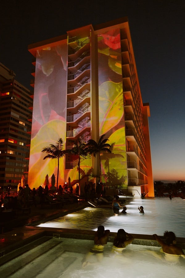 We head home, reflecting on our discoveries: the tastes and sights, locals and fellow travelers and the beauty of Oahu we’ve experienced. Back at ‘Alohilani, we head to the pool just in time to enjoy local video artist Joseph Pa’ahana’s evocative, meditative video-based art series “Light Monument” projected on the ‘Alohilani tower. The film and night ocean in the background was the perfect mood to crown our adventure.